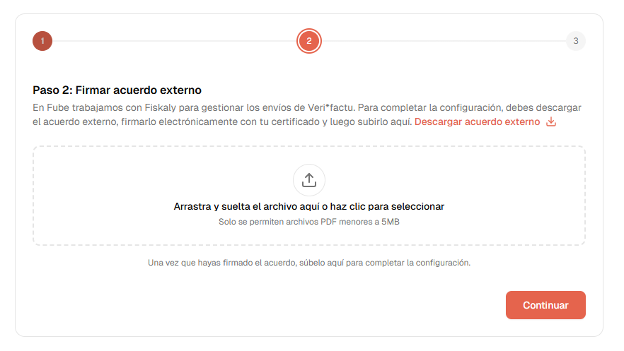 Seguidamente, se te pedirá que firmes digitalmente otro documento. Por lo tanto, tendrás que seguir los mismos pasos para el segundo PDF. Cuando lo tengas firmado, subelo también en Fube, en este caso, en el paso 3 del proceso de configuración de Verifactu.