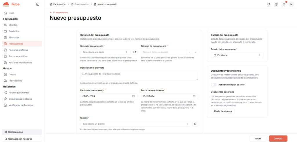 Sabemos que en tu negocio, la generación de presupuestos es tan importante como la facturación en sí. Un presupuesto claro y profesional ayuda a mejorar la comunicación con tus clientes y puede ser determinante para cerrar nuevos proyectos. Ahora, con Fube, puedes crear y gestionar tus presupuestos desde el mismo sistema, sin tener que recurrir a otros programas o herramientas externas.