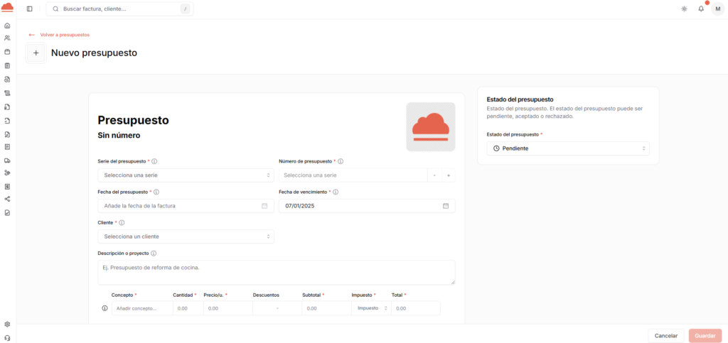 Introduce todos los datos necesarios para crear un nuevo presupuesto, como la serie o la fecha de emisión y vencimiento. También puedes agregar notas importantes relacionadas con el proyecto.