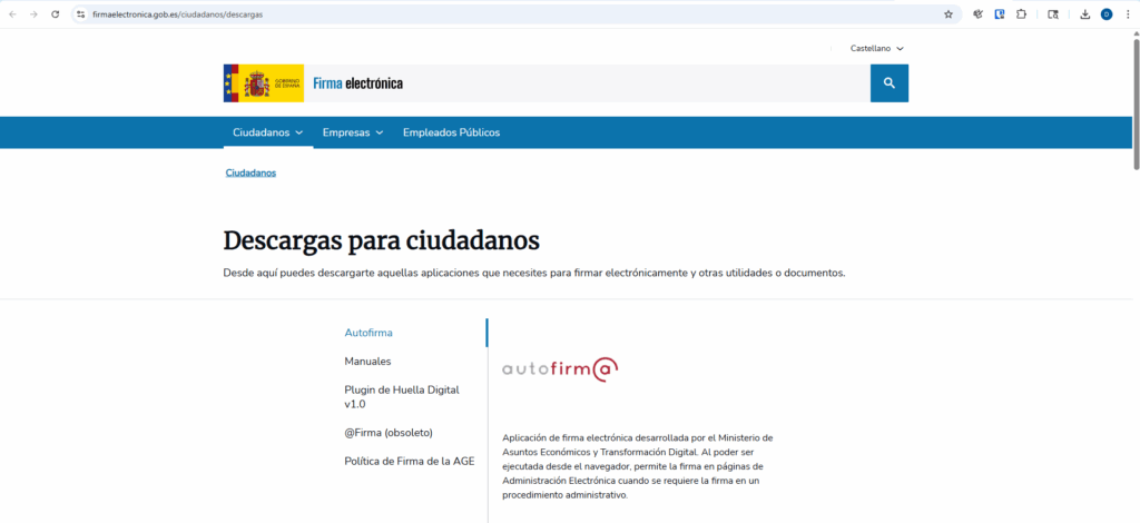 Accede a la página oficial del Gobierno de España: https://firmaelectronica.gob.es/ciudadanos/descargas